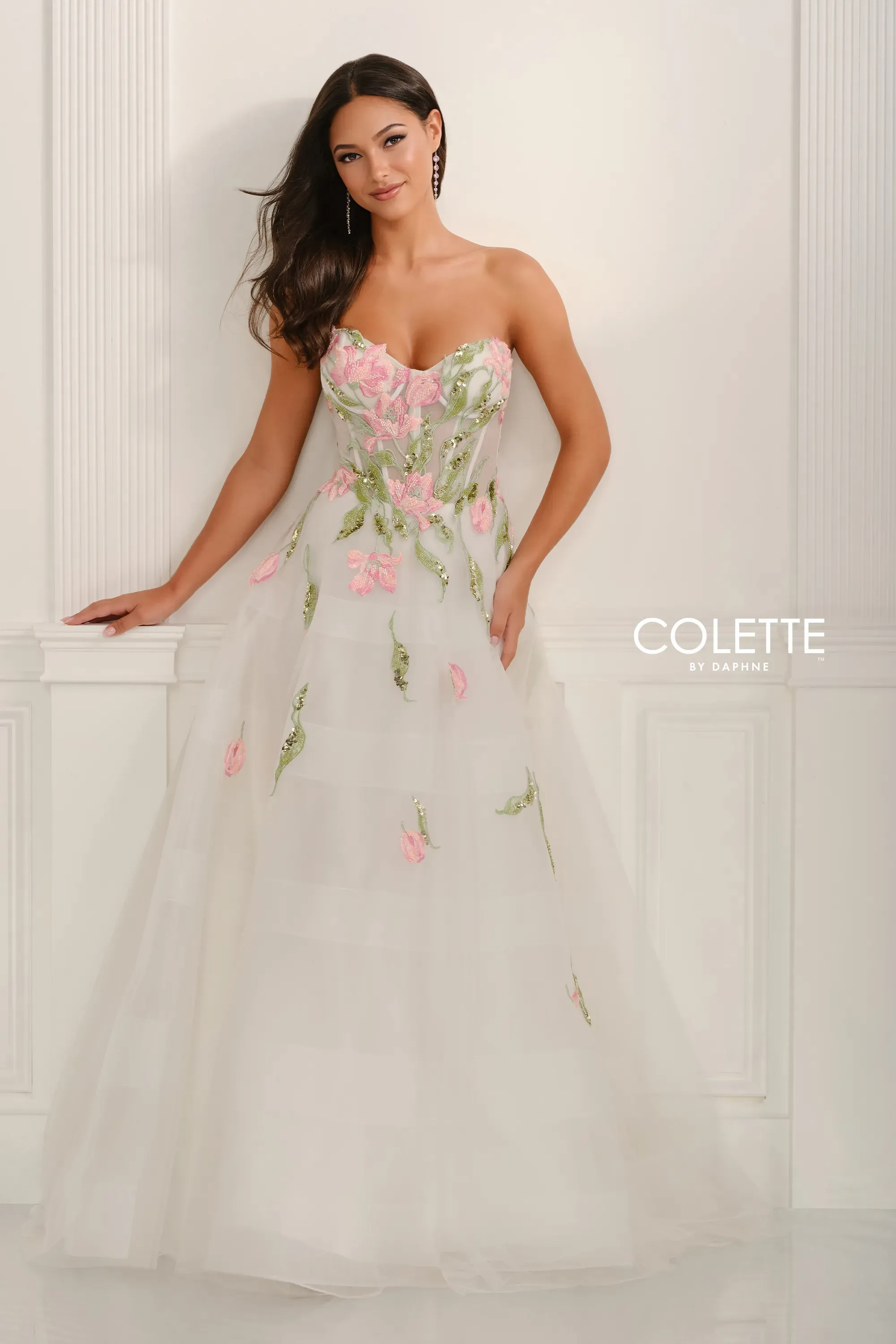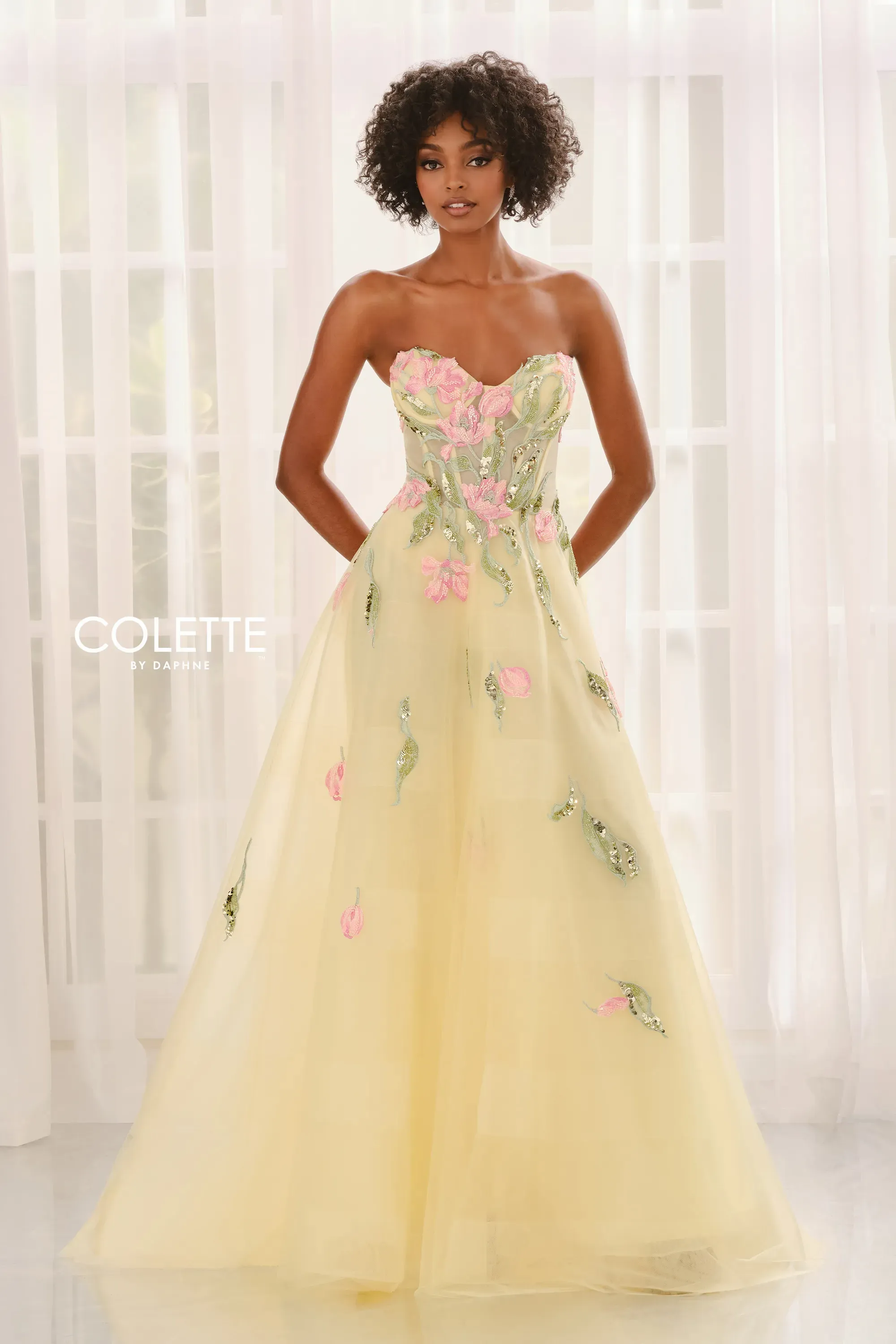 This strapless ball gown features a flowing organza skirt that moves with grace and elegance. The semi-sheer corset bodice is adorned with delicate lace appliqué, beading, and sequins for subtle sparkle. A lace-up back and separate spaghetti straps complete this dreamy look for your special night.