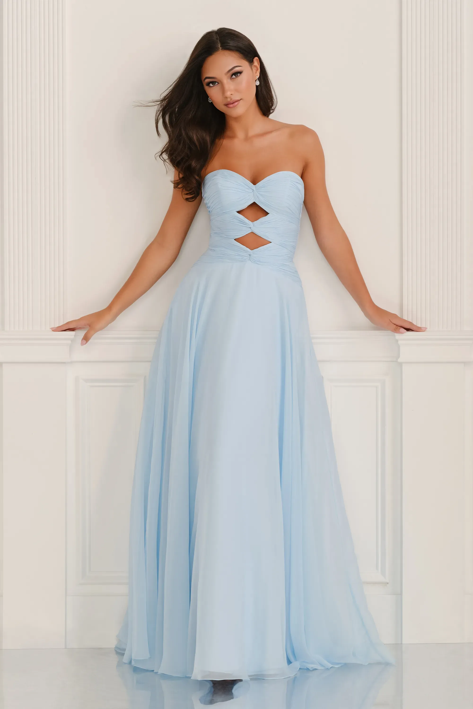 Make a statement in this strapless lilac A-line dress featuring two bold cutouts on the boned bodice. The natural waistline creates a sleek silhouette for a modern, unforgettable look.
